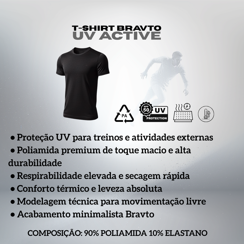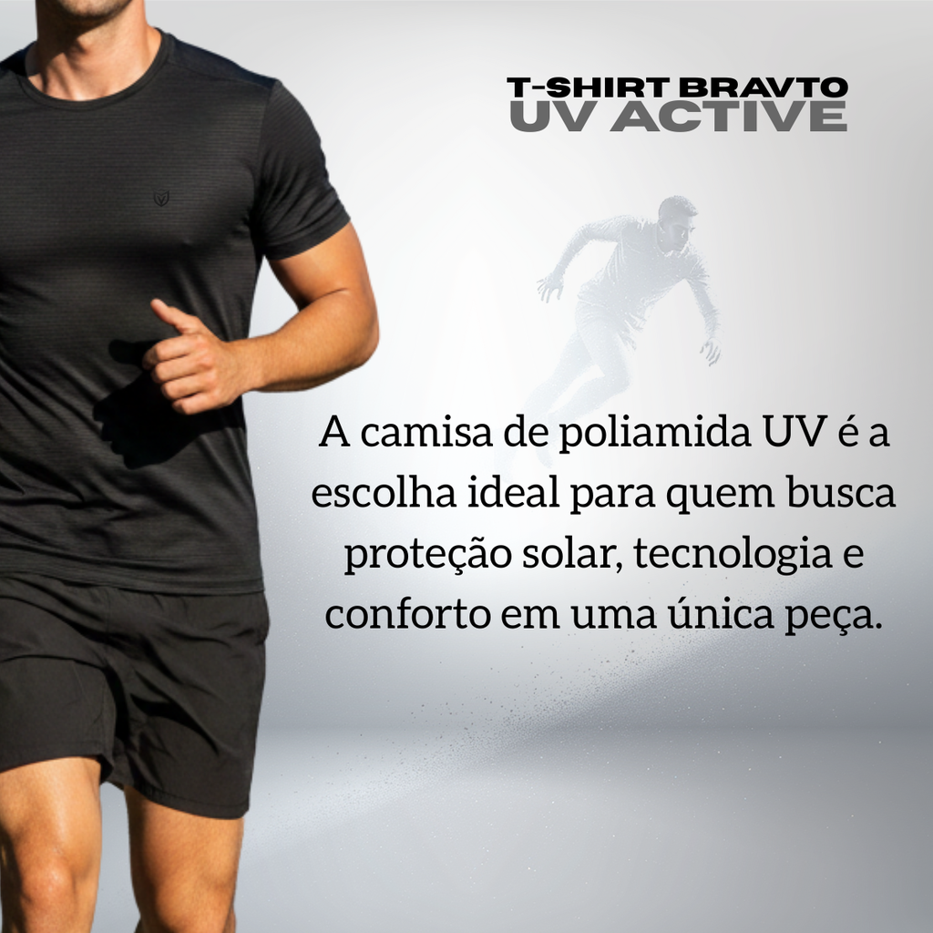 A T-Shirt UV Active foi desenvolvida para quem busca proteção solar, conforto e desempenho em atividades ao ar livre e no dia a dia. Confeccionada em poliamida de alta performance, oferece proteção UV, alta respirabilidade e secagem rápida, mantendo o corpo seco e protegido mesmo em exposição prolongada ao sol.